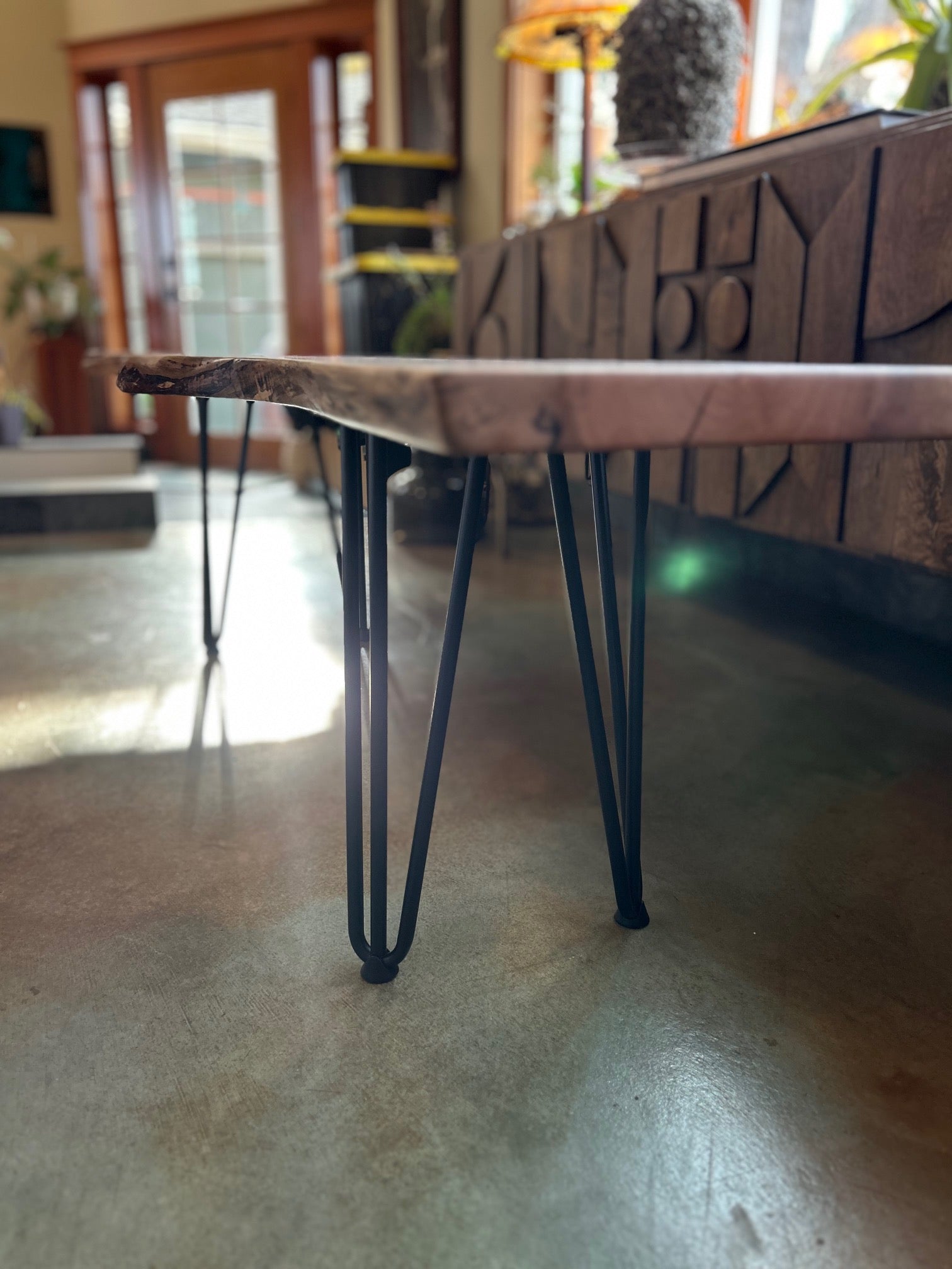This table takes its shape from the tree it was made from, featuring a double live edge and a quilted compression pattern in the grain. It stands on triple hairpin legs.