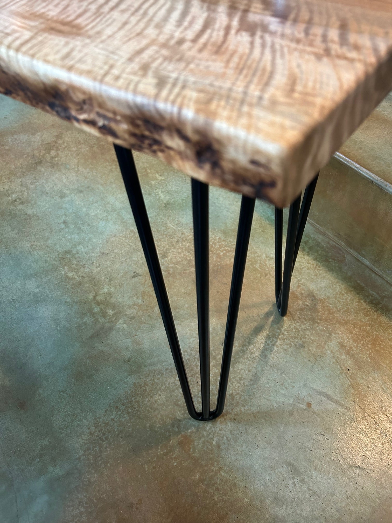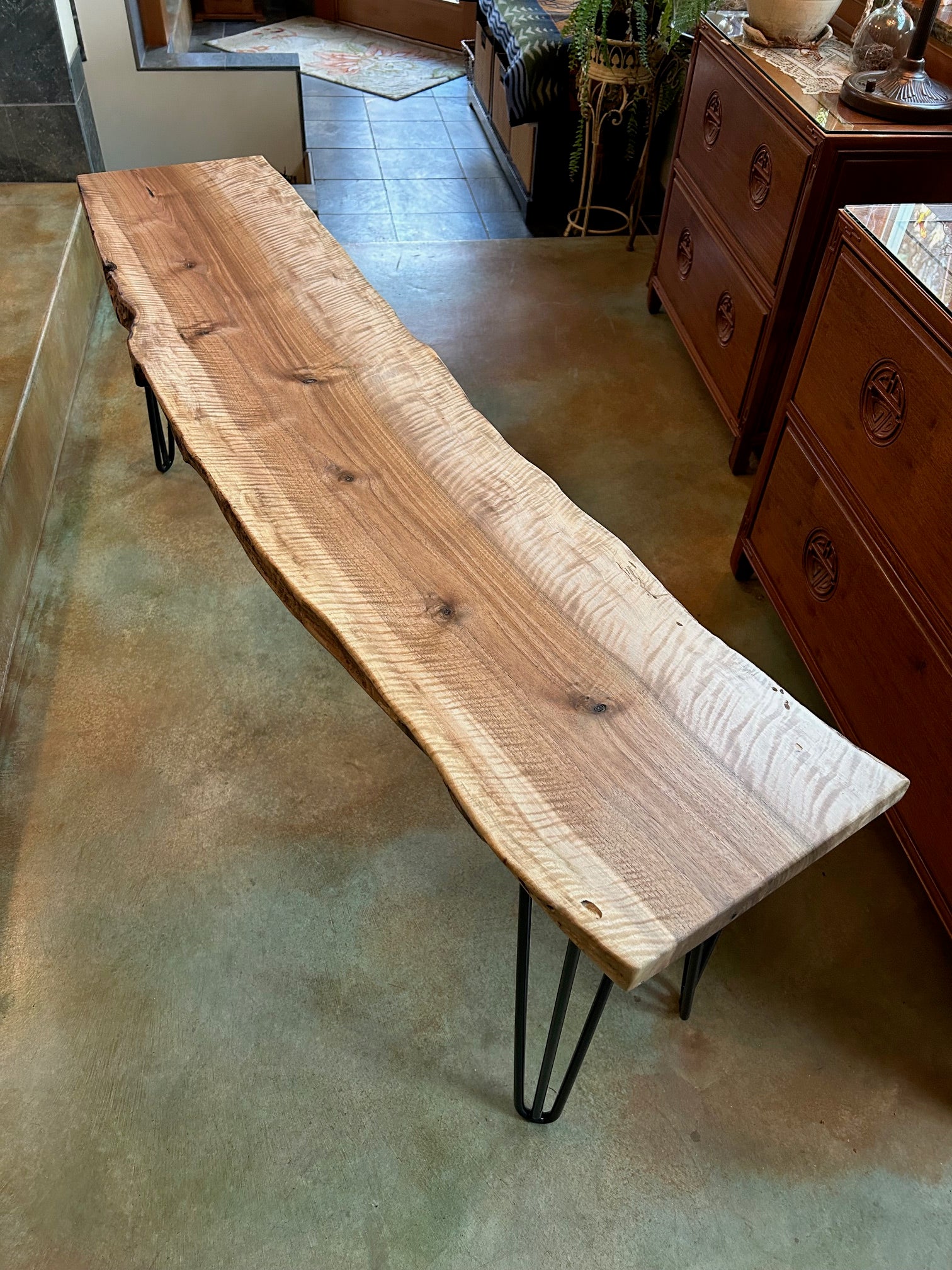 Elegant coffee table handcrafted from English Walnut wood, featuring triple hairpin legs and a quilted surface texture.