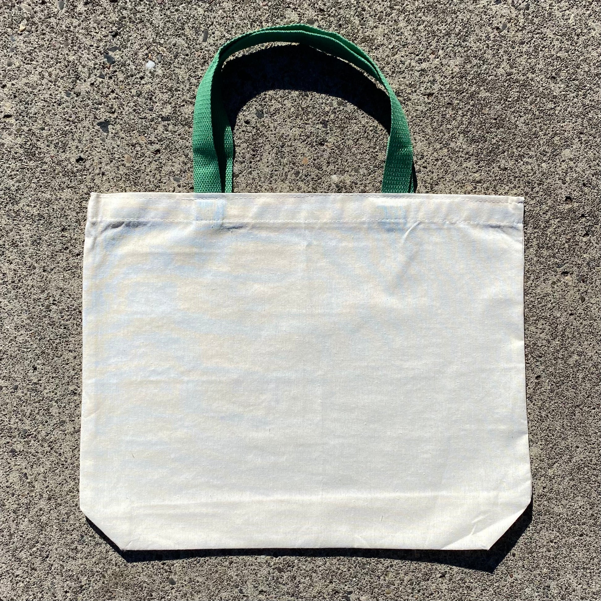 Our Tree To Table custom reusable Tote Bag. Dynamic, portable, and versatile, this open-top bag has a green handle and green printed logo on the front. 15.5 x 12".
